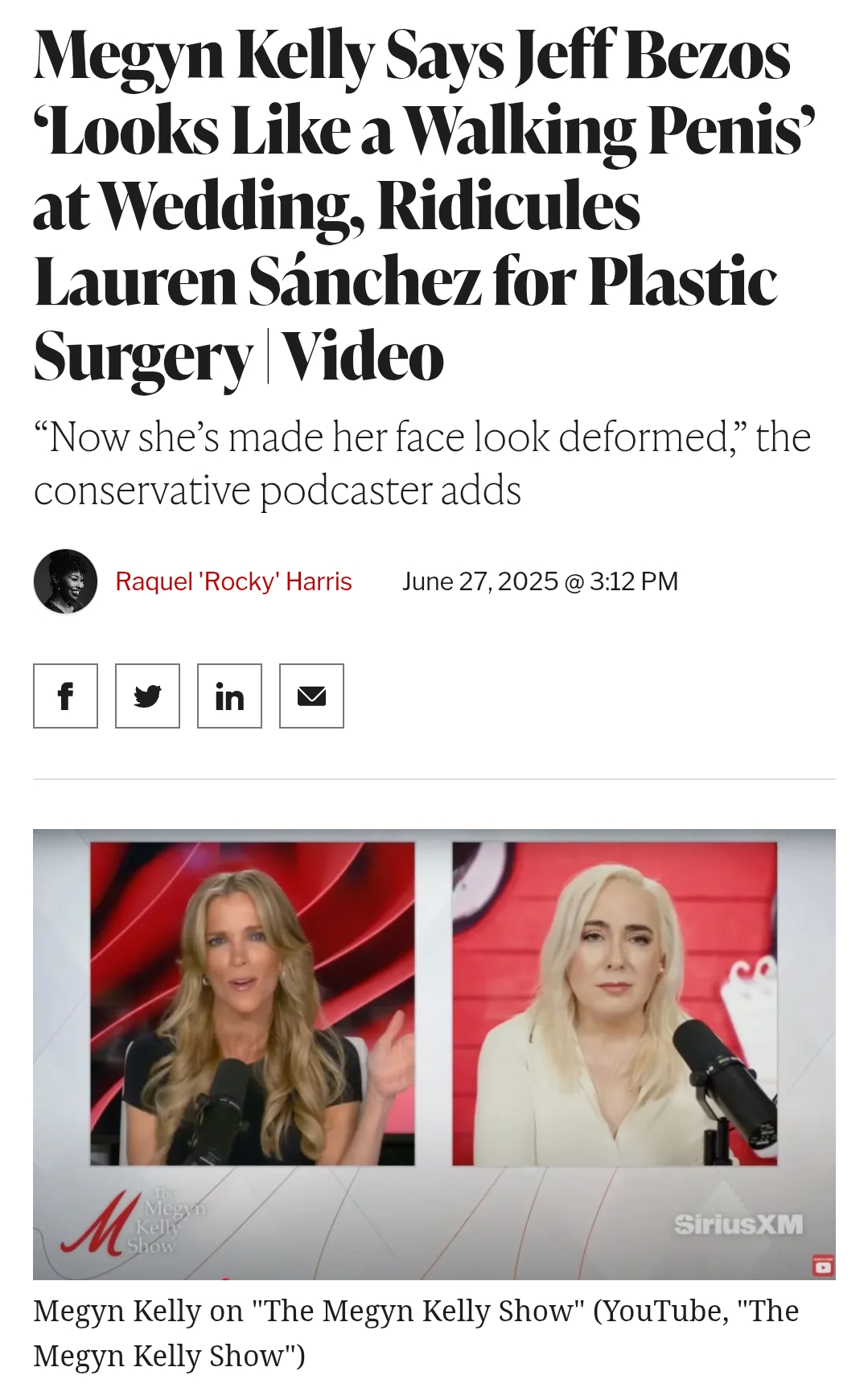 And as the protests unfolded, a different kind of spectacle emerged online: one of elite outrage. Megyn Kelly, a media figure who was fired from NBC in 2018 but kept all $69 million from her contract, denounced the wedding on her SiriusXM podcast. She called Bezos “a walking penis” and said the event was a kind of public shame ritual for Lauren Sánchez. While I found her critique quite funny, I didn’t think it was about inequality or justice. It was about what she found distasteful, embarrassing, or socially incoherent.